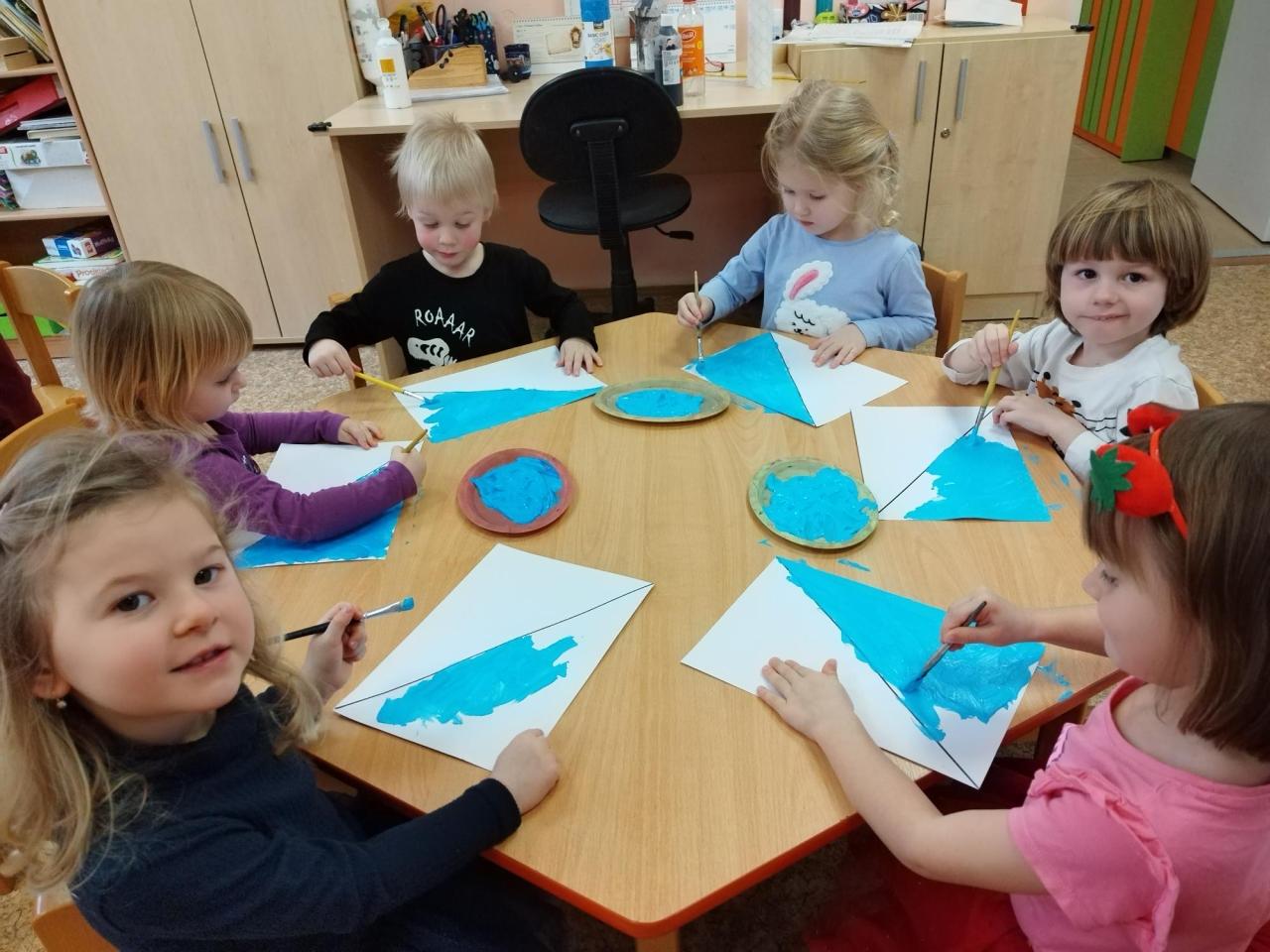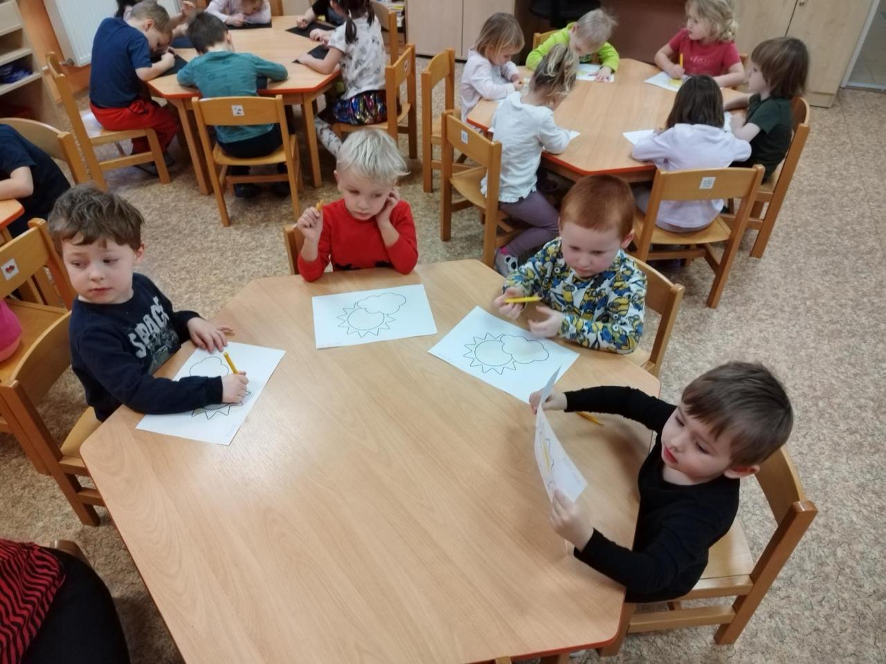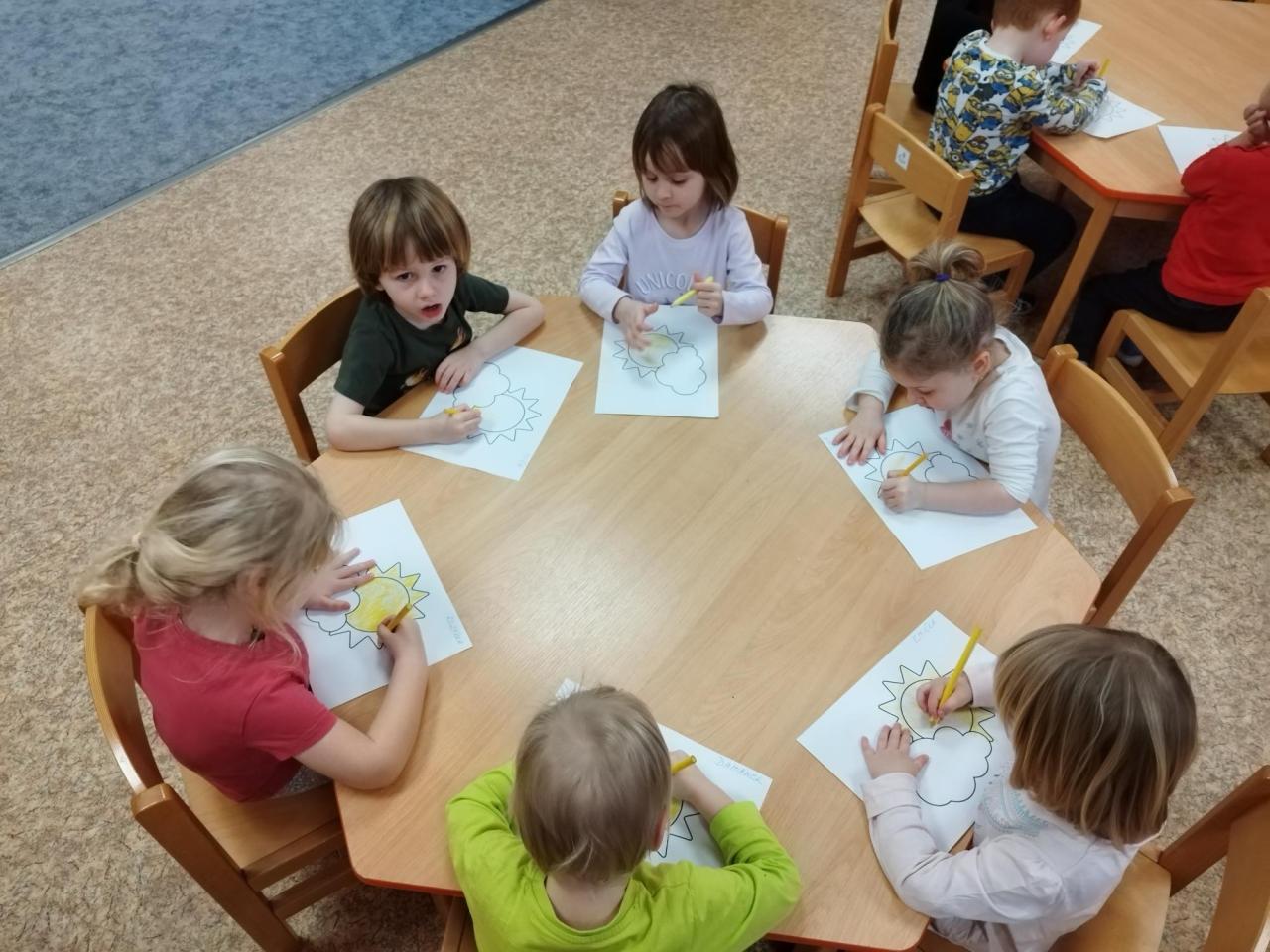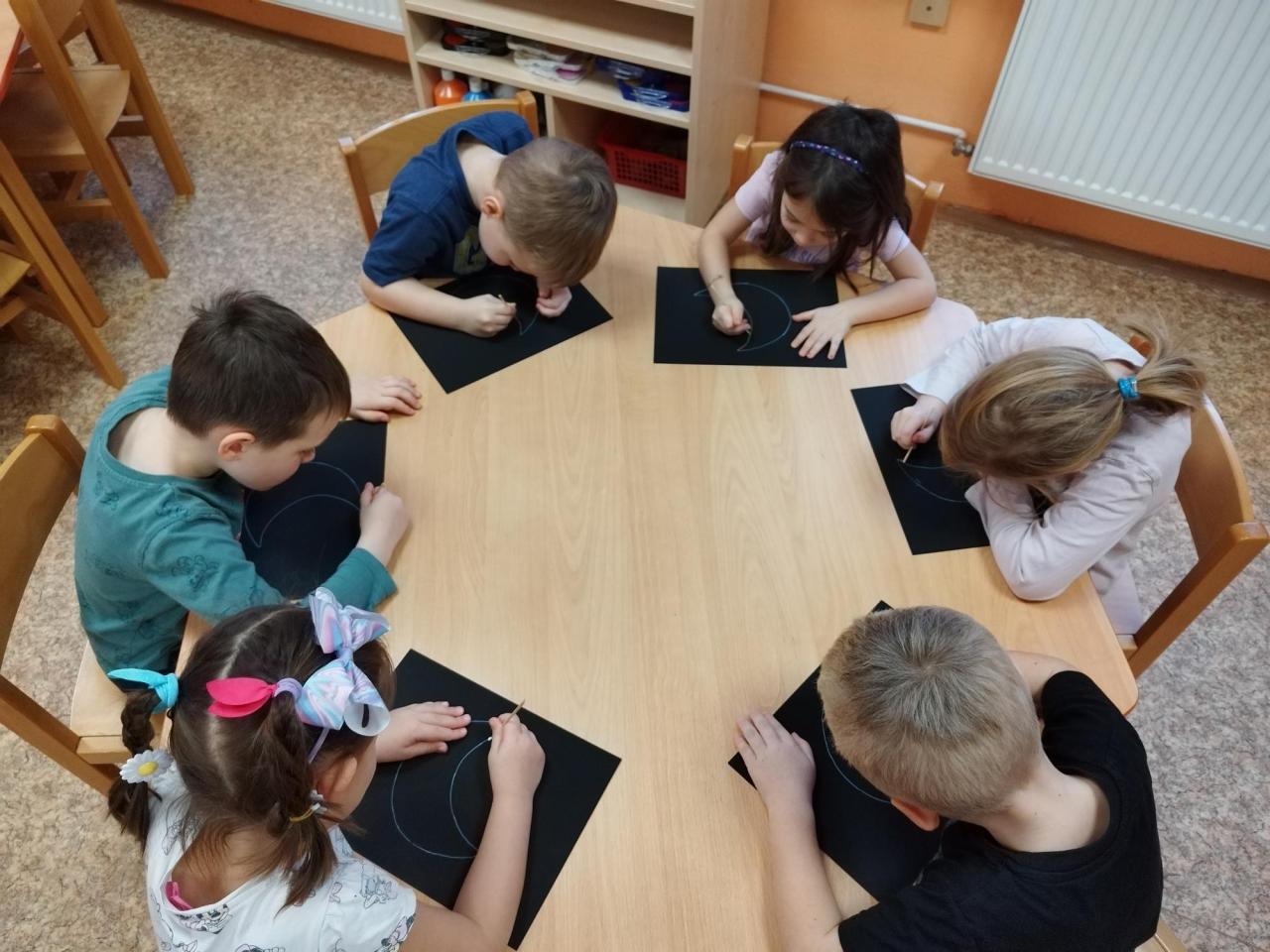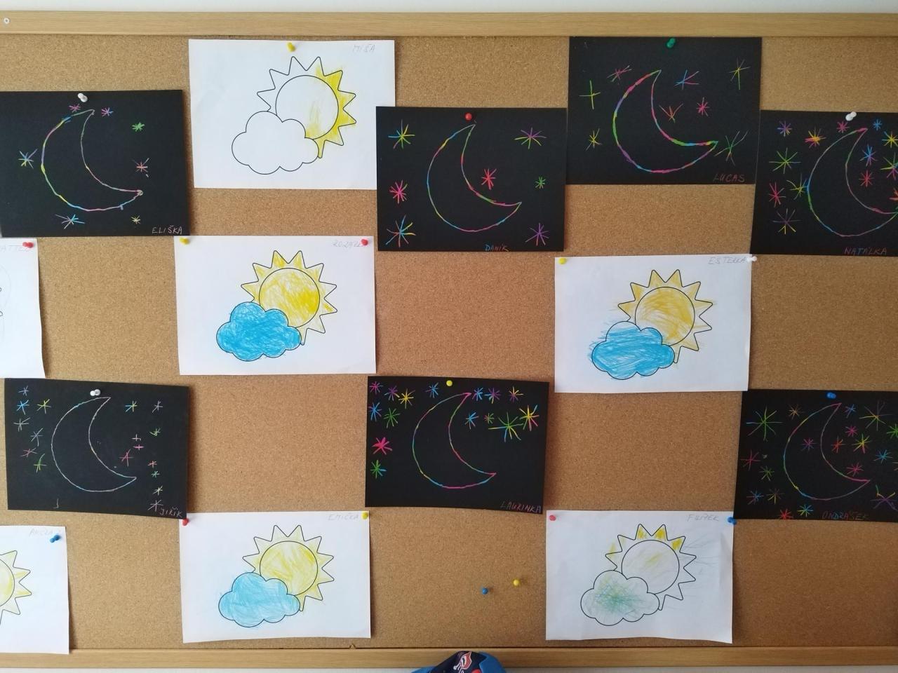 Starší děti během pracovní činnosti vyškrabávaly na černý papír s barevným podkladem, zatím co mladší děti vykreslovaly slunce pastelkami.