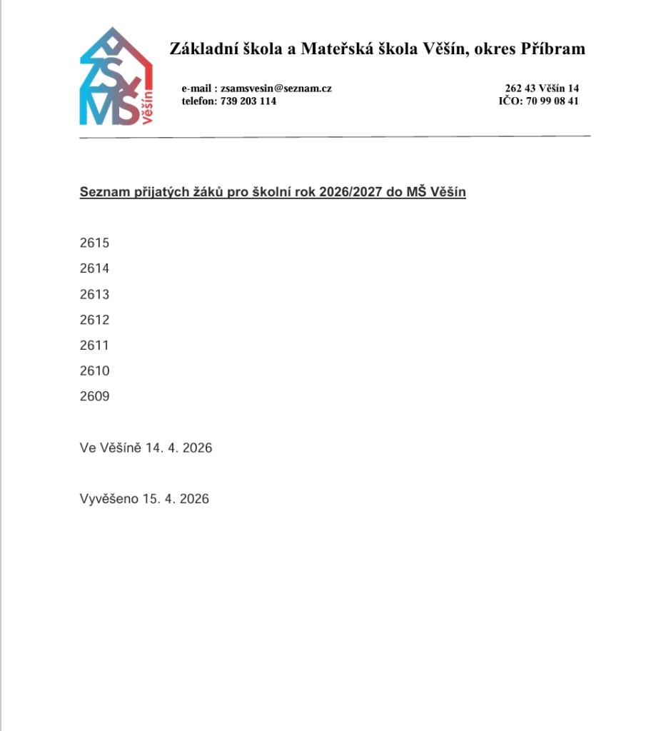 Seznam přijatých dětí do MŠ